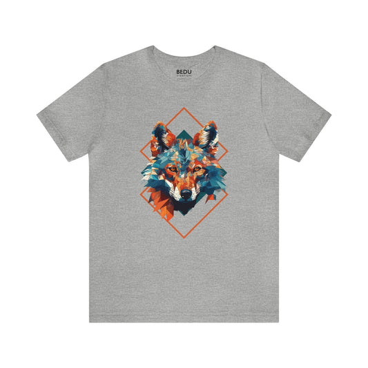 Majestic Geometric Wolf Head T-Shirt for Wolf Lovers with Turquoise, Orange, and Triangular Shapes